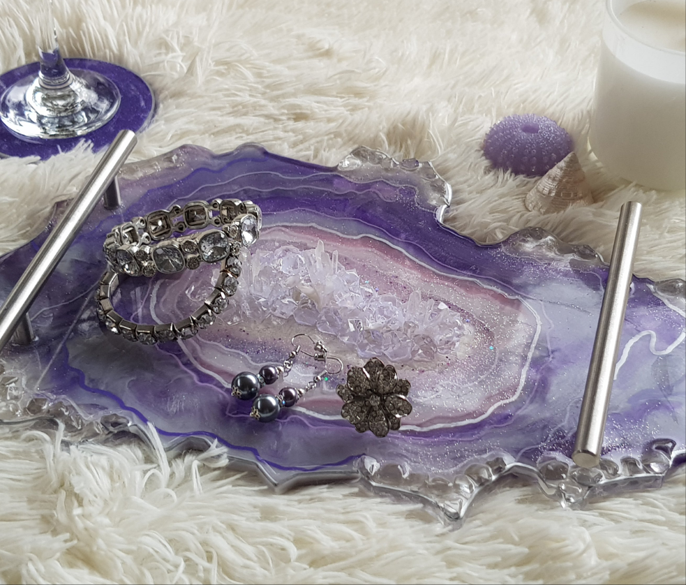 Purple and Silver Crystal Geode Dressing Table Jewellery Tray. Imagine this gorgeous handcrafted Purple and Silver Jewellery Display Tray taking centre stage on your Dressing Table.  This unique Geode shaped Resin Tray features Angel Aura Quartz Crystal Gemstones, Faux Diamond Gems and Silver toned handles.  With pretty shades of Purple, White and Silver and loads of sparkle it is ideal to show off your precious Jewellery items.  There are silicone rubber feet underneath the tray for stability and to protect against surface scratches and is approx. 33cm x 21cm.